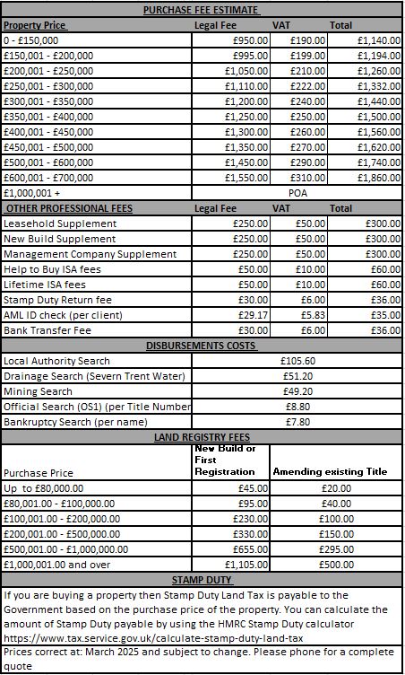 The fees listed above will only cover the services mentioned. If your matter requires additional work that is not included in this estimate this will be discussed with you by your solicitor/conveyancing executive, and you will be informed of any additional cost at the earliest possible time. Transactions may exceed the quoted timescale for completion when they are particularly complicated. In addition there may be additional charges applicable which depends on the unique nature of the transaction e.g. properties with a second charge secured on the title require more work, the property may have a defective legal title, a Licence to assign is required, the property is unregistered title, a Deed of Trust is required, a Statutory Declaration is required, we need to obtain an indemnity insurance policy on your behalf, you wish us to post your deeds amongst others. The fees listed above are for information purposes and do not consititue a formal quotation. For a formal quotation please call us today on (01773) 535535 (Eastwood Office) or (01159) 305070 (Ilkeston Office) for a FREE no obligation Conveyancing quote.